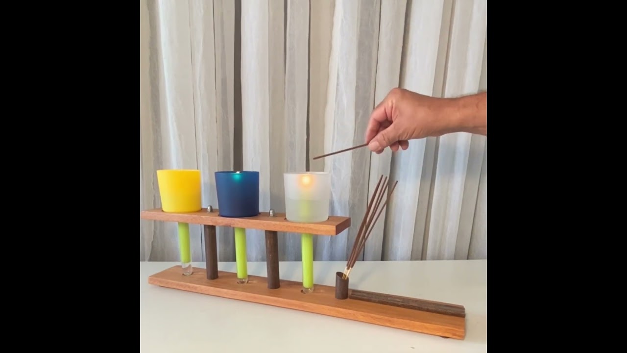 O Candelabro Zen é uma peça versátil multifuncional, que reúne incensário e candelabro triplo para velas flutuantes. Construído com tubos de aço corten e madeira de reflorestamento.